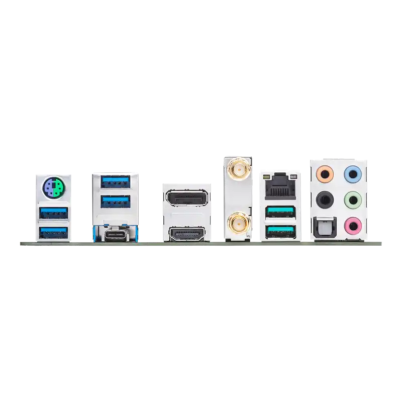 USB-C 10 G | 4 × USB 3.2 | 2 × USB 2.0 | Wi-Fi antenna | 2.5G LAN | HDMI | DP | 5-audio jacks | S/PDIF